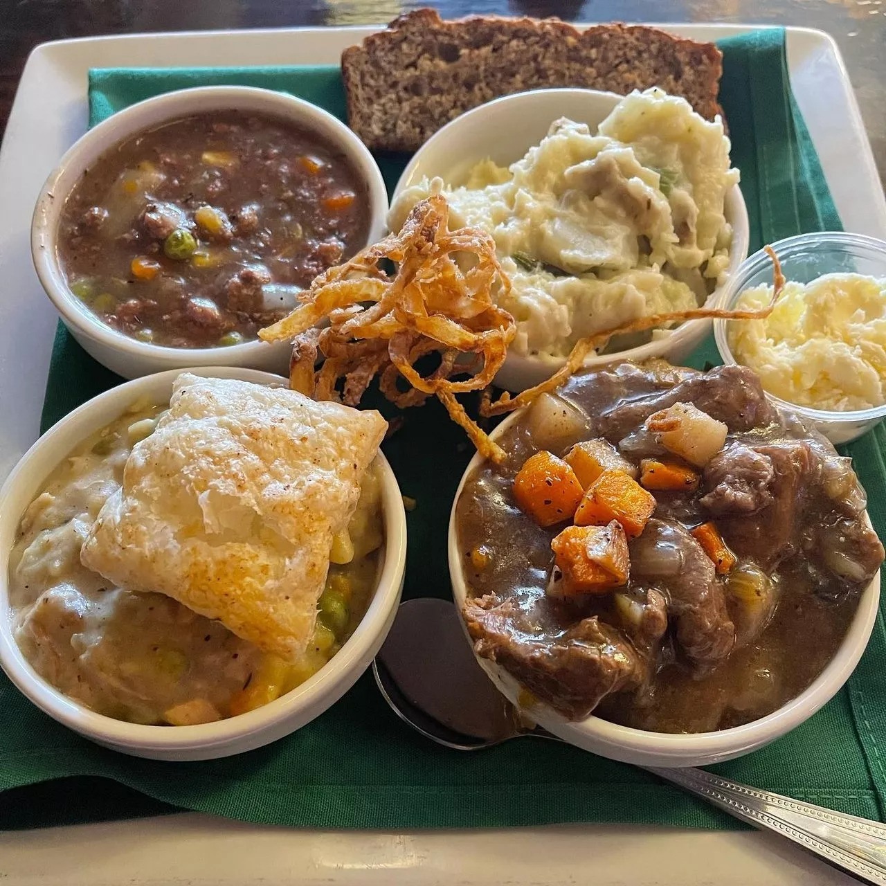 Also, you can try chicken and bread pudding, or the traditional Irish boxty that comes in four flavors.