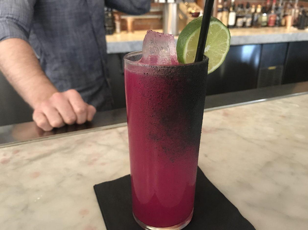 - Patron Silver Tequila, dragon fruit, lime, grapefruit, habanero bitters, and a black salt rim