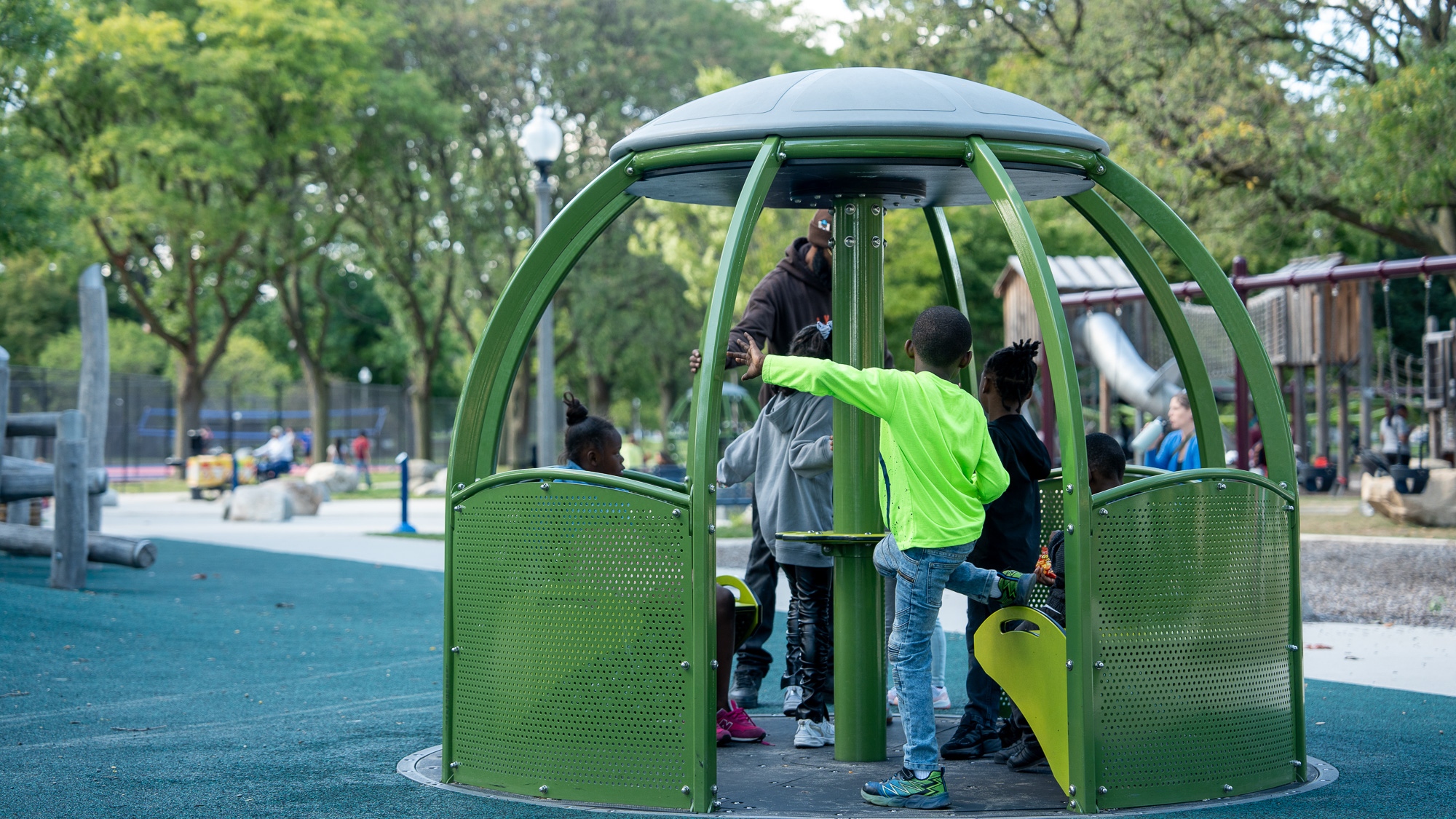 Dodge Park in Sterling Heights is a great all-in-one stop. It has a big playground with climbing structures and swings, a splash pad (fee applies), walking trails, basketball court, and plenty of picnic space. They also host fun seasonal events like concerts, farmers markets, and even ice skating in the winter!